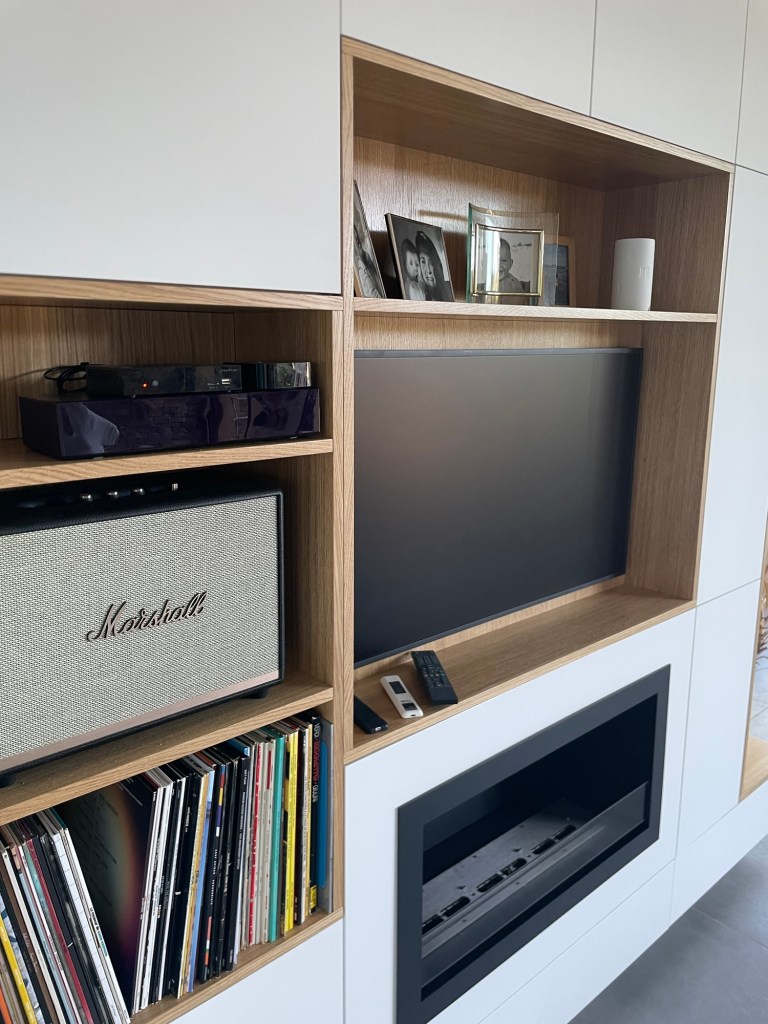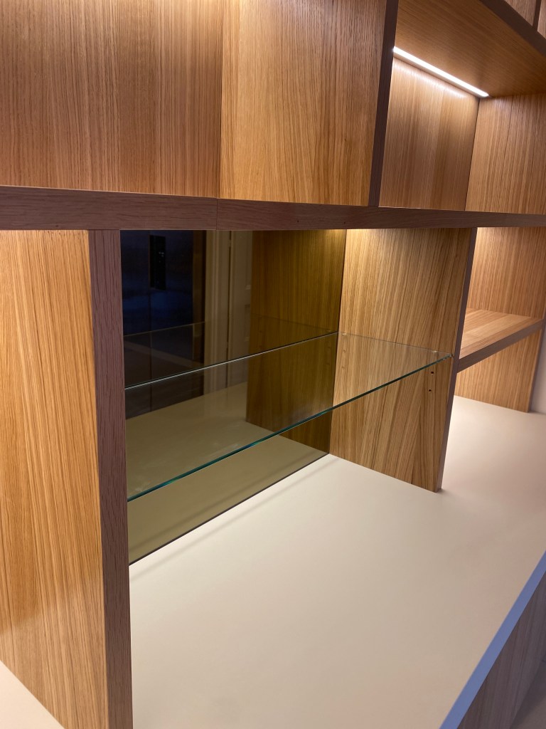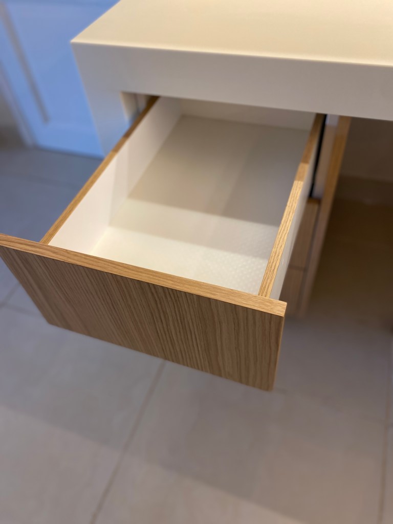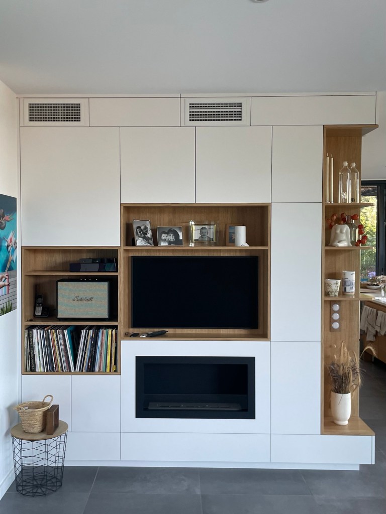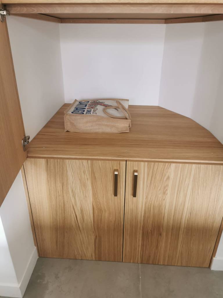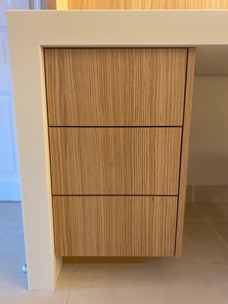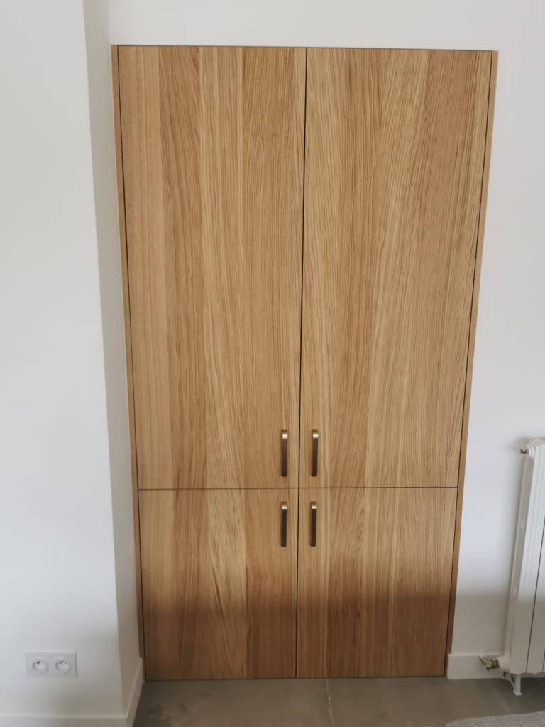 Caisson en melamine cream sur mesure, Facades portes et tiroir en placage chêne vernis ave ouverture sans poignées en push to open.