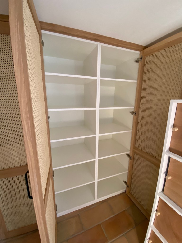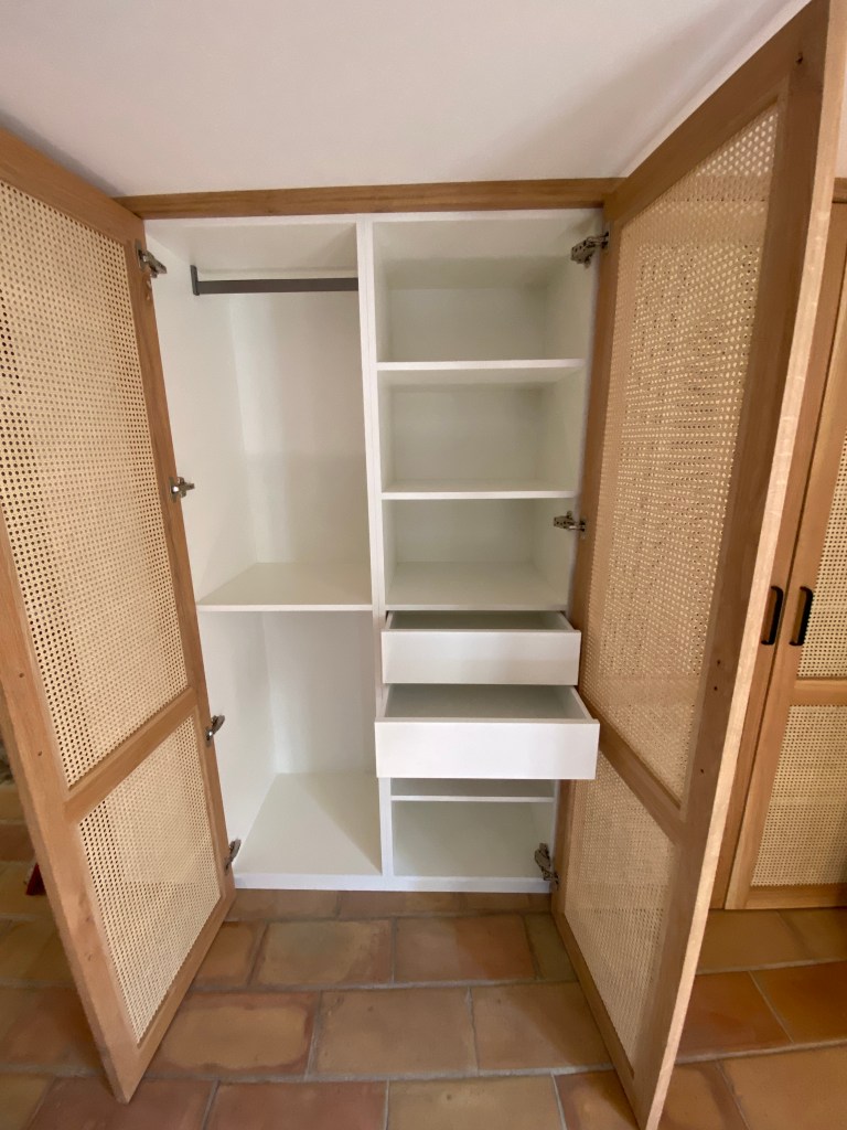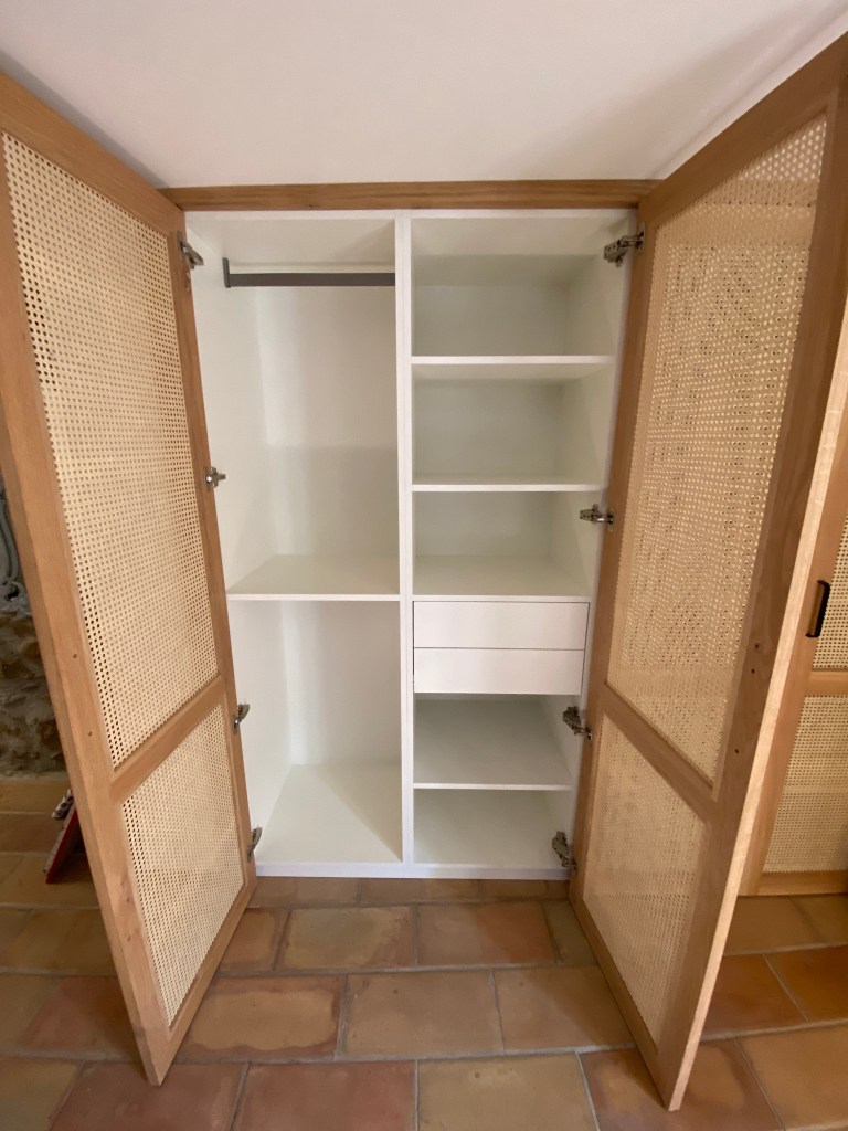 Dressing, porte en chêne et cannage interieur en melaminè blanc tiroir sur mesure Hettich, poignées Viefe