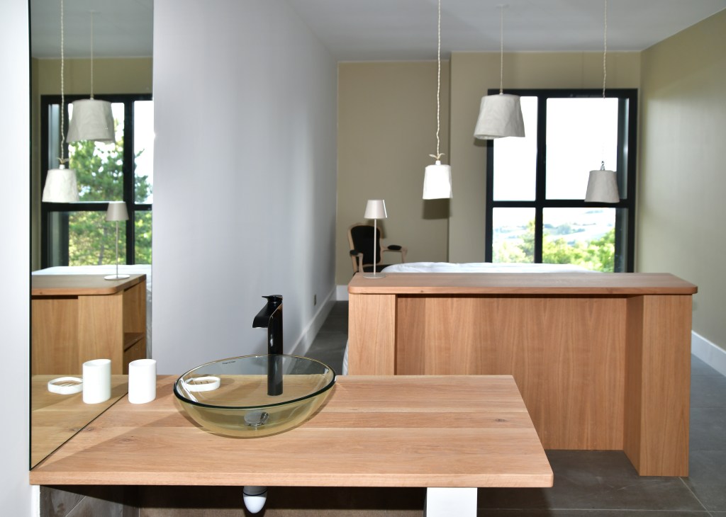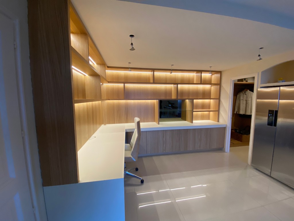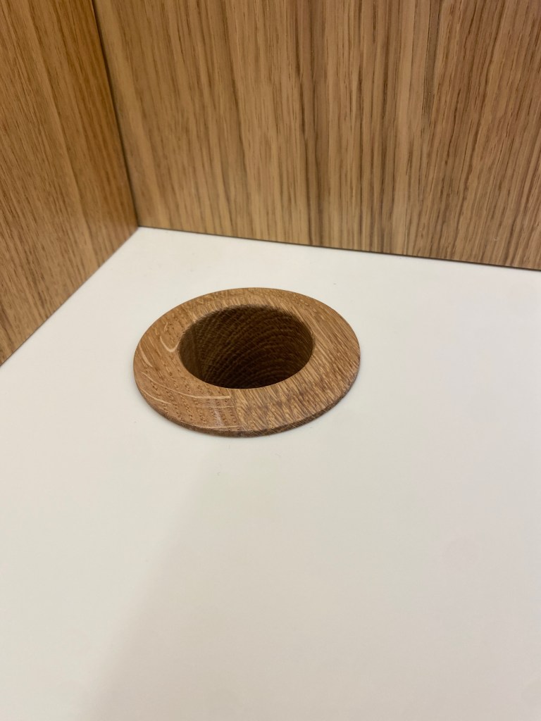Plan de travail en Hi-Macs couleur cream, passe cable en chêne massif fabriqué au tour sur mesure.
