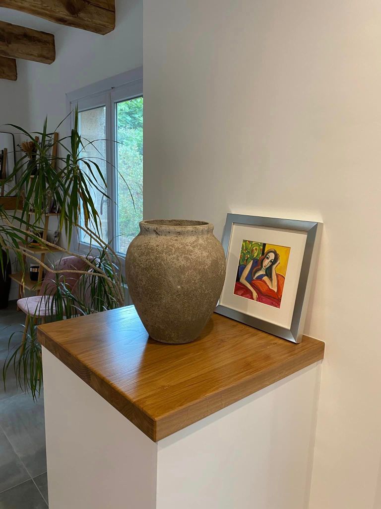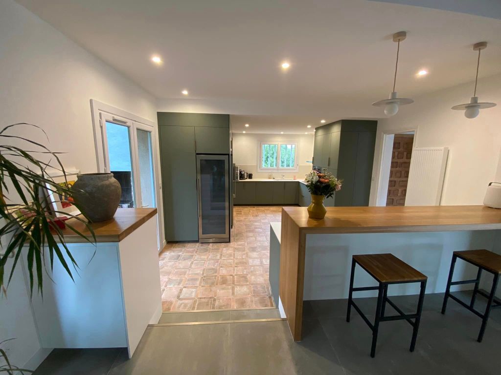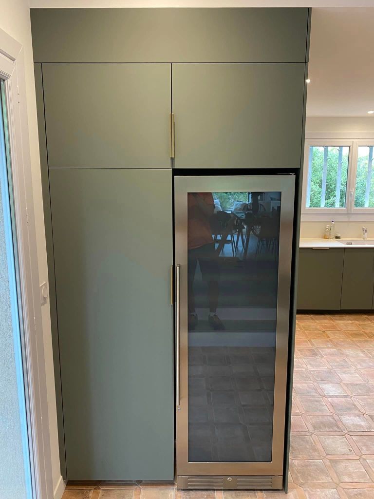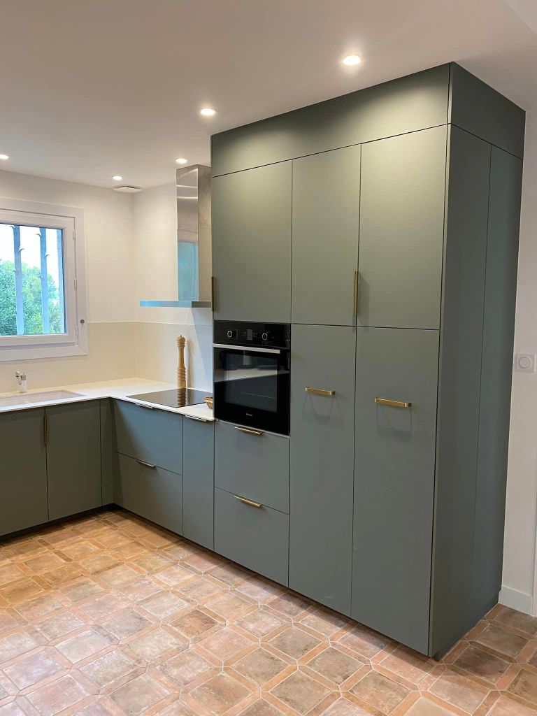 Cuisine vert mat, plan de travail en céramique, poignée Viefe, Bar et servante en chêne massif.