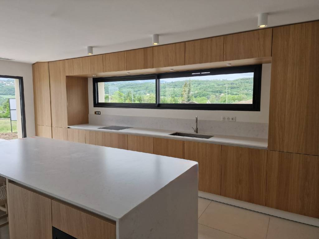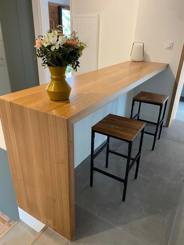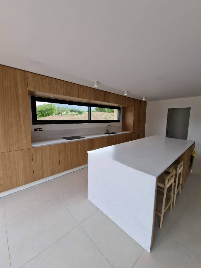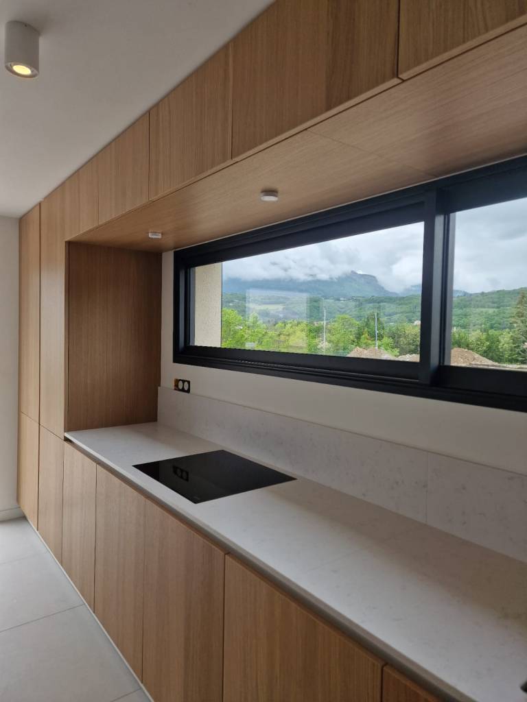 Cuisine placage chêne, plan de travail en quartz, plaque incrustée.