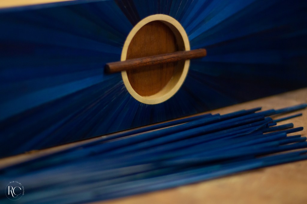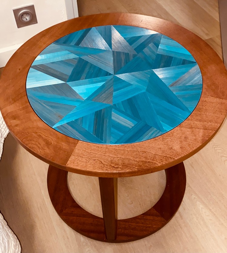 Table basse en Sipo, Plateau en marqueterie de paille.