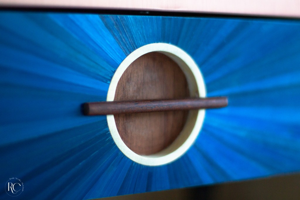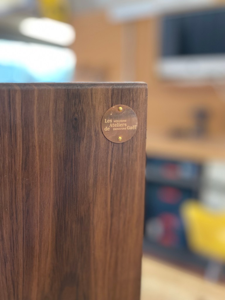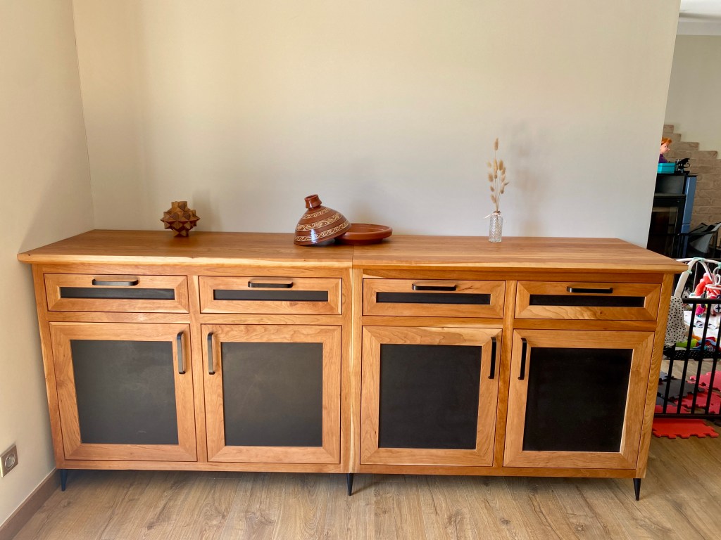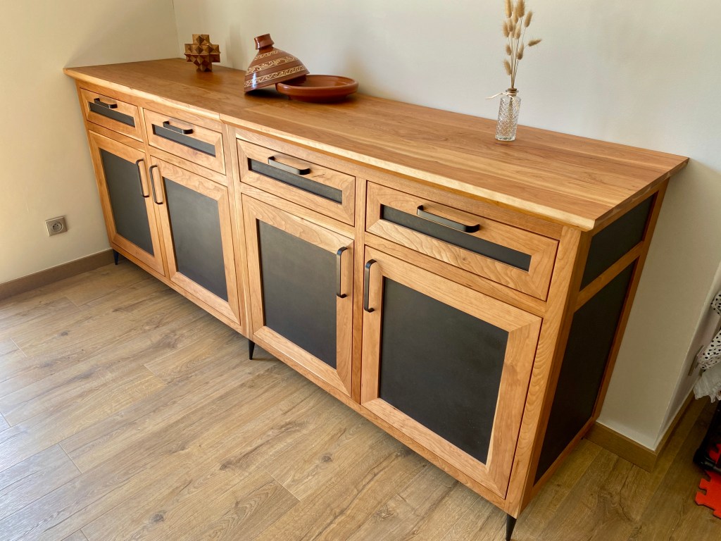 Meuble massif en Noyer Français, panneau en MDF noir teinté dans la masse, Poignée Viefe.