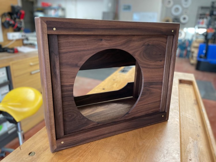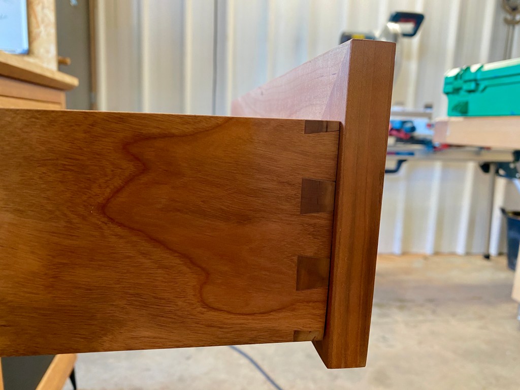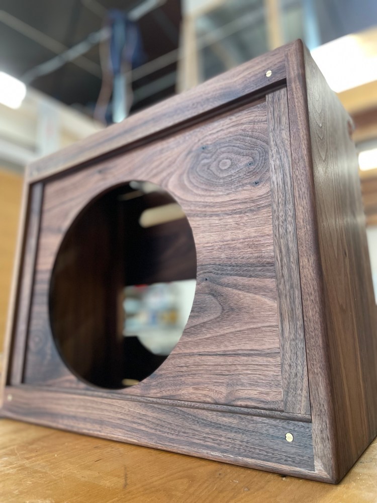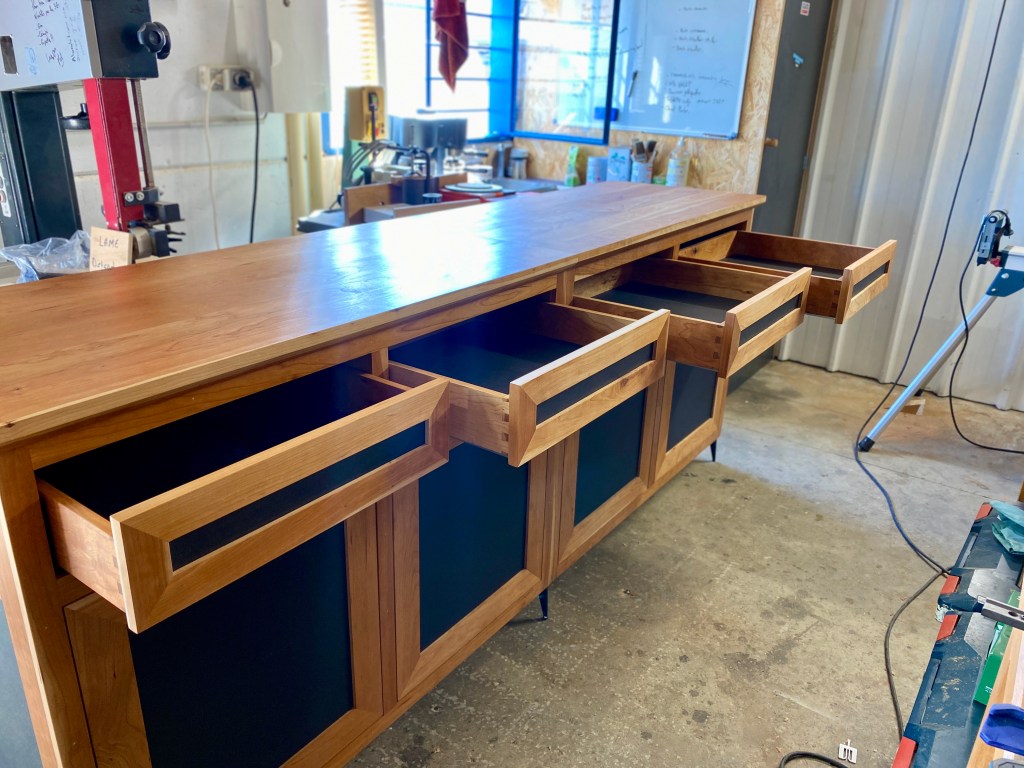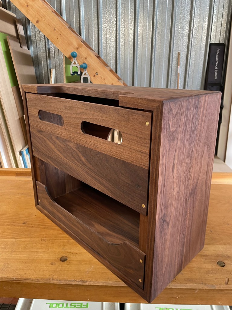 Meuble massif en Noyer Français, panneau en MDF noir teinté dans la masse, Poignée Viefe.