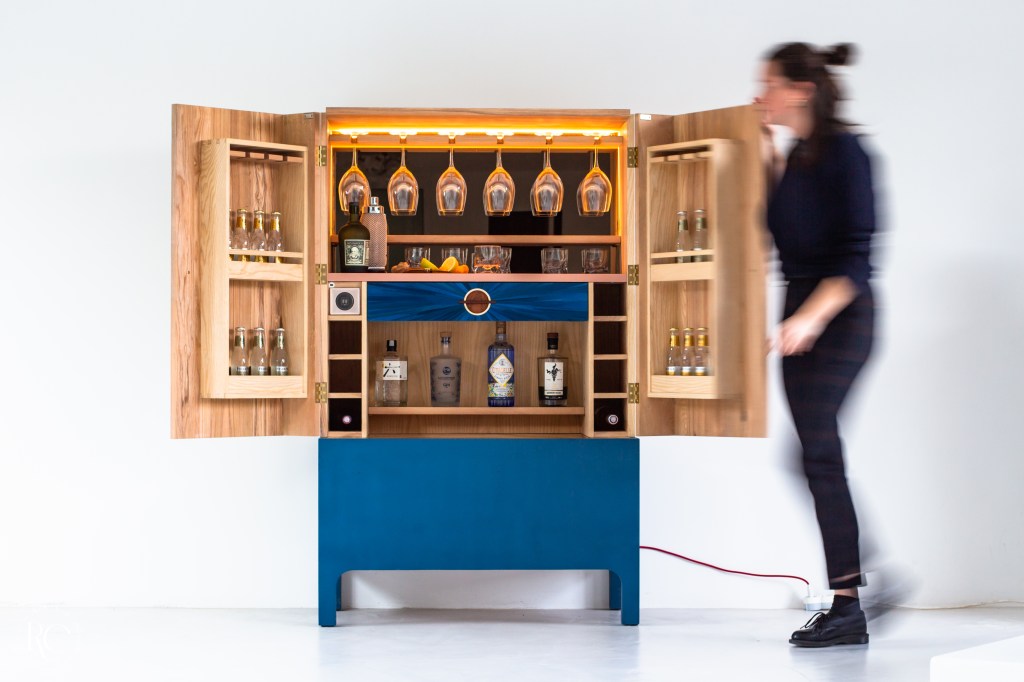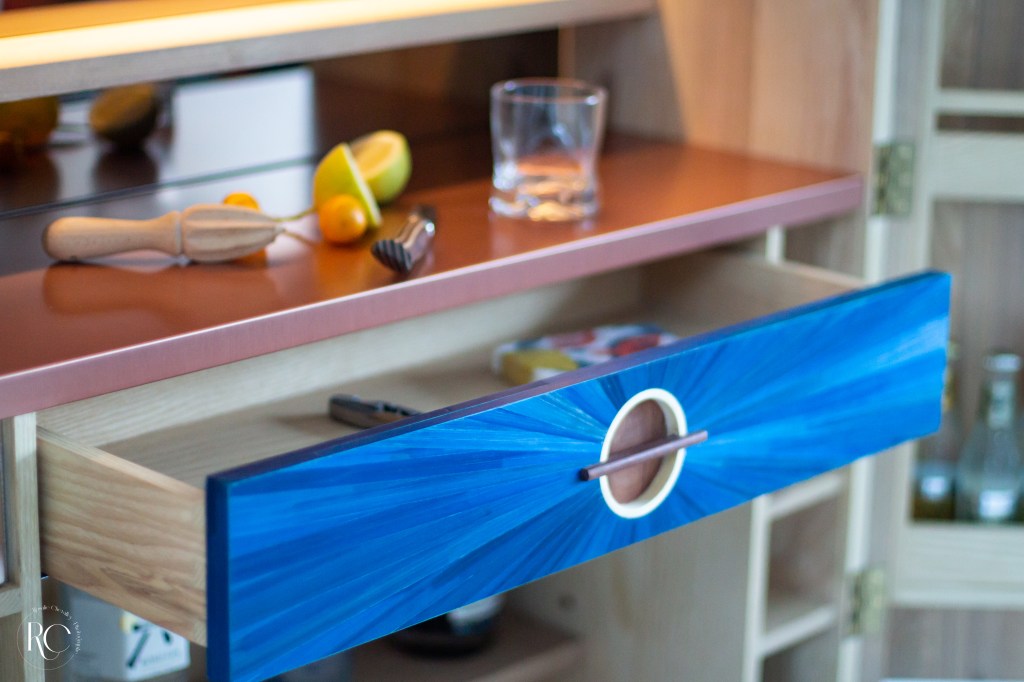 Bar de Luxe en frêne, tiroir en marqueterie de paille avec poignée incrustée tilleul et sipo, miroir couleur bronze.